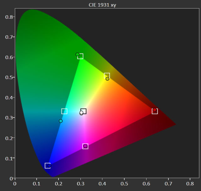 「参照」モードの色域測定結果。白い四角の枠がRec.709の基準点を、各色の丸い点が測定結果を示している。RGBの3点がRec.709基準に沿っていることから、Rec.709をターゲットにしているものと判る。