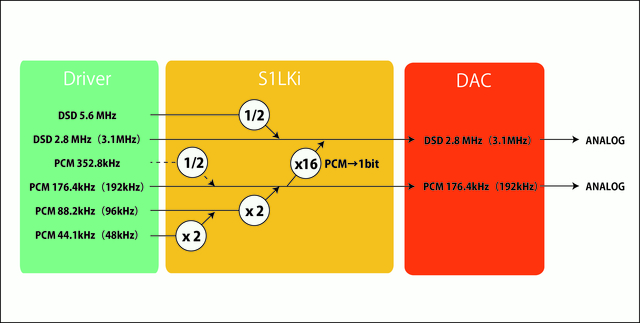ローランドの独自開発による変換技術「S1LKi」(シルキー)の概念図。DSPの内部で、全ての信号を2.8MHz/1bitとした上でDA変換する仕組みだ