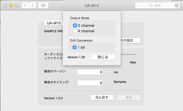 こちらがMacでの「UA-M10」の設定画面。画面が違うものの、設定項目や基本的な操作はWindows環境と同一。ヘッドフォンアンプとして使用する場合の出力モードは「2channel」でOK