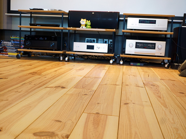 床は24mmのパイン無垢フローリング。柔らかく人肌にもやさしいが厚みがあるためスピーカーの音もしっかりしている