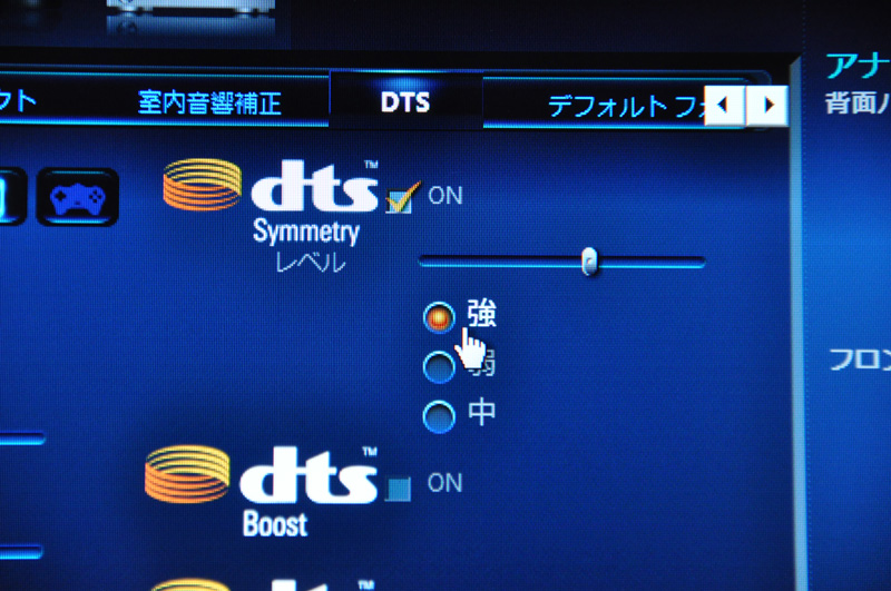 DTS Symmetry(TM)の効果は強/中/弱から選べる