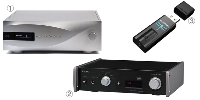 (1)はdCSのハイエンドD/Aコンバーター「Vivaldi DAC」(\3,870,000)。(2)はTEACの小型D/Aコンバーター「UD-501」(¥110,000)、(3)はAudioQuestのスティック型USB-DAC「Dragon Fly」(¥26,190)。価格は大きく異なれど、いずれも“USB-DAC”としての機能を備えている