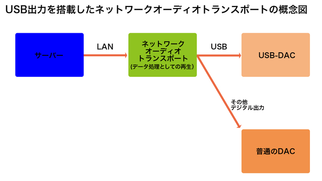 USB出力を搭載したネットワークオーディオトランスポートは、オーディオシステムにおいて上図のような役割を担う