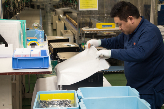 最後の仕上げとなる梱包作業。出来上がったばかりのAV8802Aが丁寧に梱包されていく