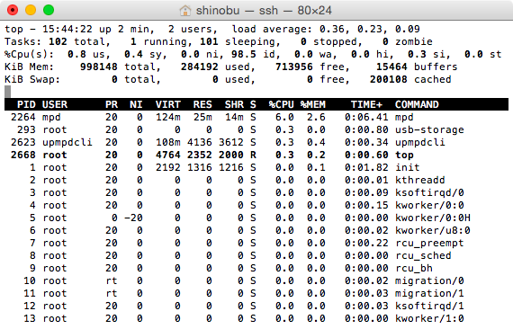 デフォルト設定(CPU 900MHz/GPU 250MHz)でFLAC 192kHz/24bitを再生しているときのtopコマンド。CPU負荷は6%前後で推移した