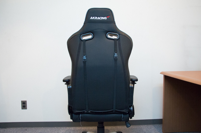Pro-Xを背面から見たところ、背もたれの穴から伸びているのはランバーサポートを装着するベルトだ