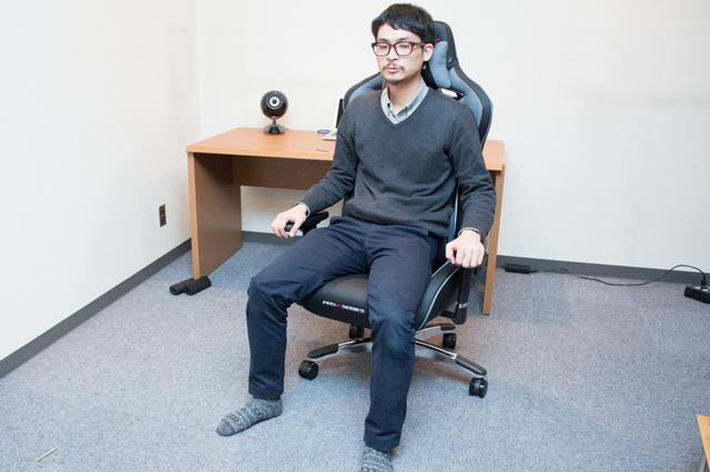 完成したPro-Xに座って装着感を確認している編集部・小澤