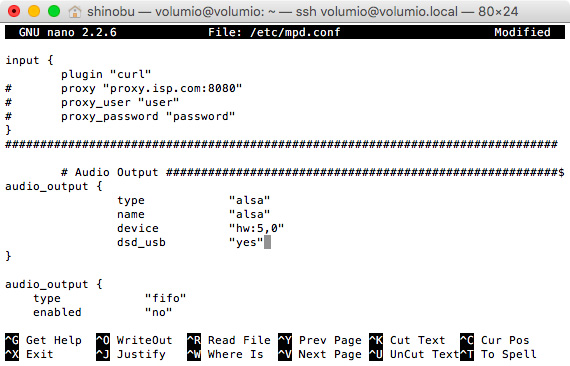 DSD(DoP)再生を行う場合、現時点ではテキストエディタを使い/etc/mpd.confに「dsd_usb