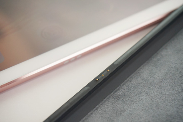 iPadの側面にあるSmart Connectorどうしをくっつける。Smart Keyboardにはマグネットが仕込まれているので、本体に近づけると磁力で吸い付く