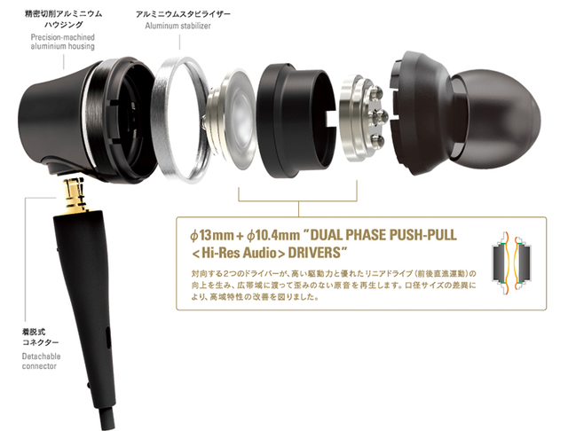 口径の異なる2つのドライバーを組み合わせた新「DUAL PHASE PUSH-PULL〈Hi-Res Audio〉DRIVERS」を搭載。口径サイズの差異により、高域特性の改善が図られたという