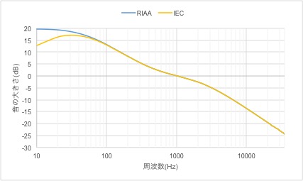 RIAAカーブとRIAA-IECカーブの比較。RIAA-IECは低域のノイズの抑制を狙い100Hzからイコライゼーションが始まっている