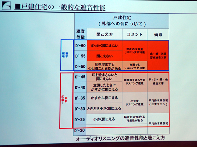 遮音等級の解説。今回の物件は戸外へはD'-50からD'-55というレベルの高い遮音性能を実現