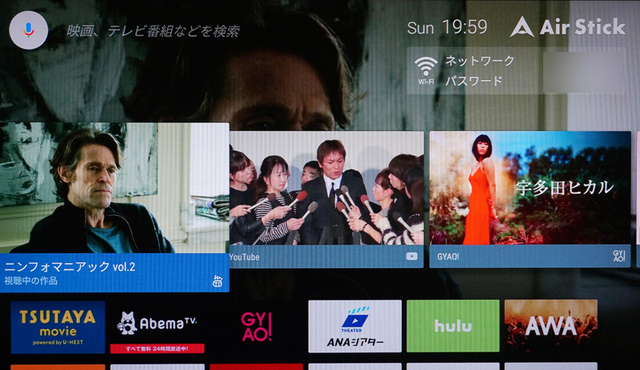 AirStickのホーム画面。Android TVのプラットフォームそのものだ。右上にWi-FiルーターのSSIDとパスワードが表示される。オン・オフはアップデートで対応予定