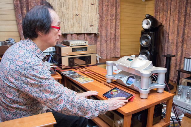 自宅試聴室で試聴を行う角田氏。スピーカーシステムにはB&W「802 D3」を用いた