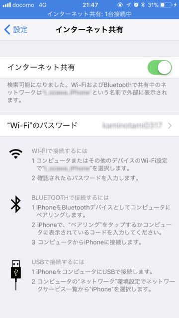 テザリングの画面を開いてしばらく待つと、「インターネット共有」の表示が現れる。この状態になったら接続が成功だ