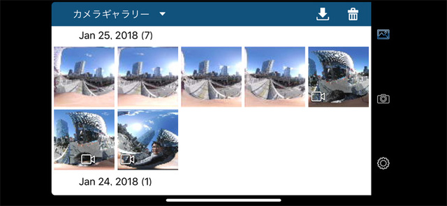 撮影した動画・静止画は日付けごとに整理された状態でリストに並ぶ。ファイルをいったん端末にダウンロードすれば、カメラをオフにした後もスマホの画面で動画・静止画が視聴できる。