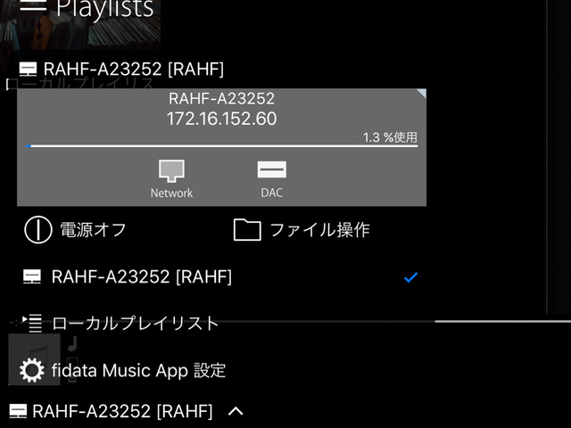 fidata Music Appの画面左下に表示される「サーバー名」をタップすると、サーバー切替、Soundgenicのネットワーク/DAC機能切替やIPアドレス確認が行える