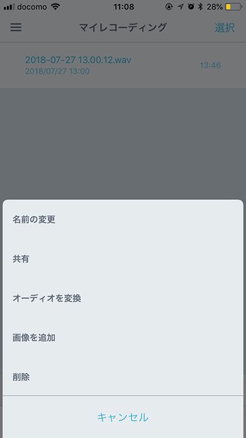 録音ファイルの名称変更、サムネ画像の設定、共有などができる