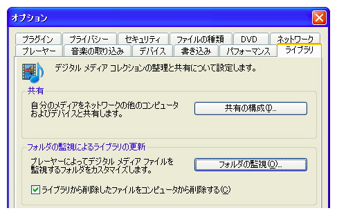 DLNAの設定はオプション画面の「ライブラリ」タブ経由でも行うことができる