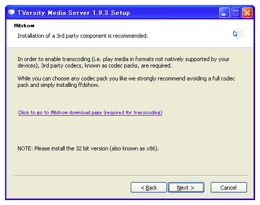 TVersityのインストール画面。トランスコードに必要な外部プログラム(ffdshow)のインストールを促される