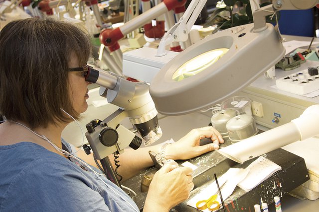 カンチレバーにテンションワイヤーをつけているところ。オルトフォンには女性従業員が多数在籍しており、精密な作業は彼女達を中心として行われている