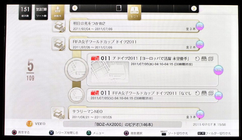 レコーダー側の番組は、複数HDDの切り替えと同様に、画面上にタブとして追加される。この画面は「シリーズ表示」もしている状態だ