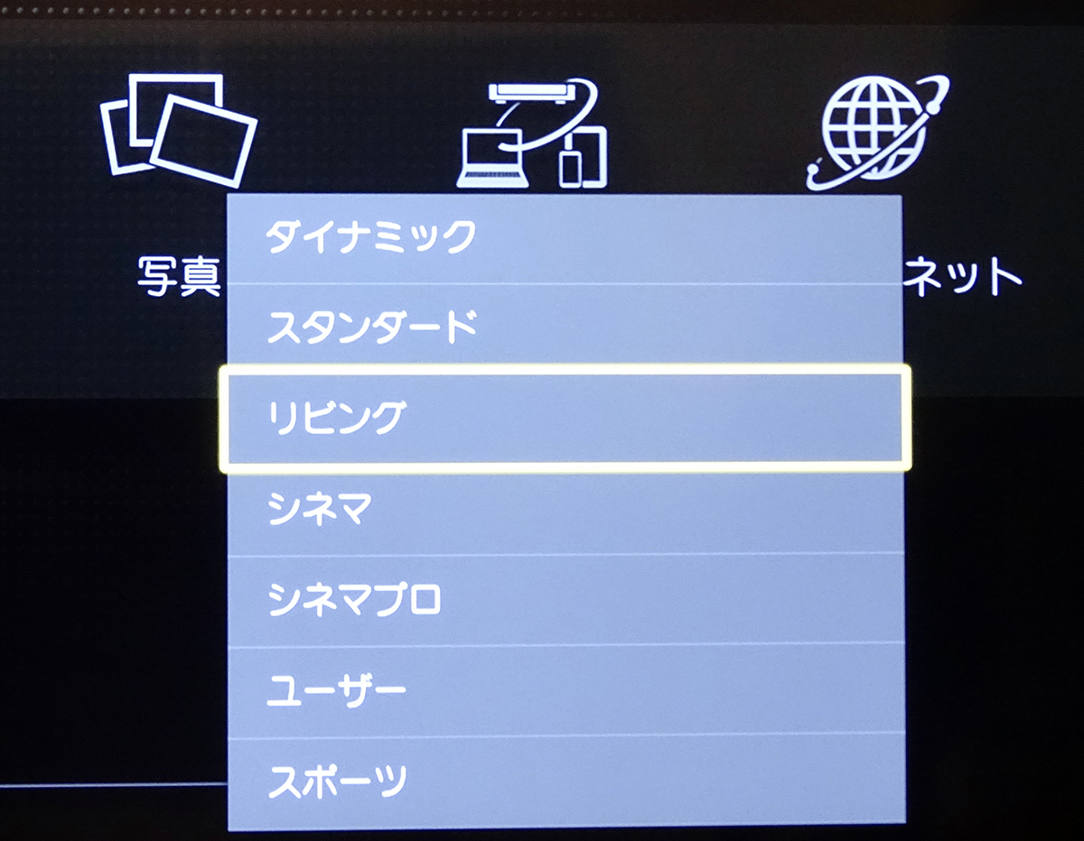 「GX850」に用意されている画質モード。BS 4K放送は「スタンダード」および「リビング」で、UHD BDの映画ソフトは「シネマ」および「シネマプロ」で視聴をおこなった
