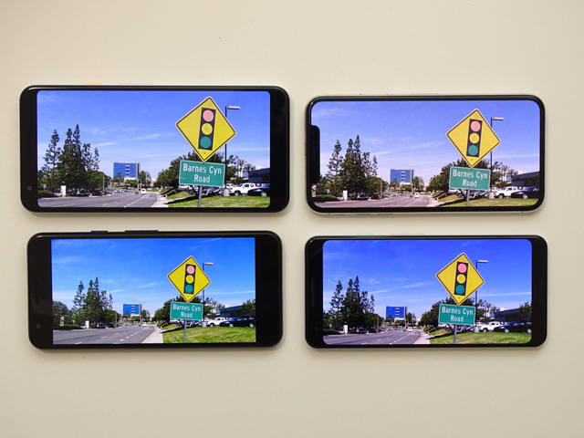 ディスプレイの表示を比較。左上がPixel 3a XL、左下がPixel 3a、右下がPixel 3、右上がiPhone X。特に左側のPixel 3aシリーズどうしで色合いに違いが表れた