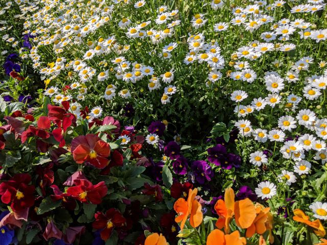 晴れた日の昼間にPixel 3a(左上)/3a XL(右上)とPixel 3 XL(左下)で花壇を撮影。白い花の花弁の模様も白トビせず立体的に写る。自然な色合い、明暗の再現力はiPhone Xのカメラ(右下)に引けを取らない