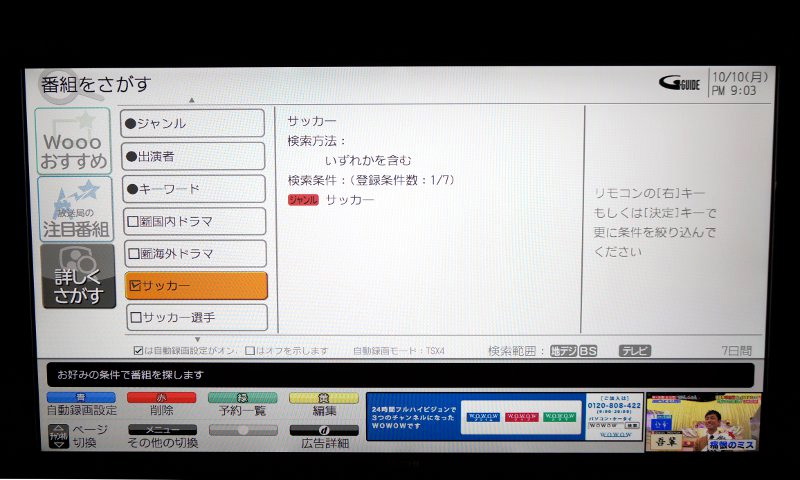 「詳しく探す」の画面に入り検索条件をセット。リモコンの「青」ボタンを押すと自動録画として登録できる