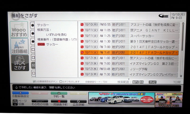 ジャンルで「サッカー」を登録しておくと自動的に番組を検索。この結果と同じ番組がすべて録画されるので見逃す心配はない