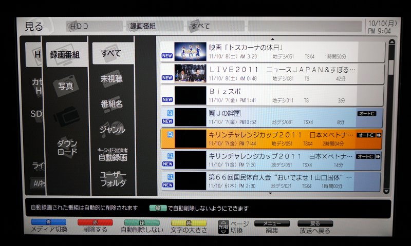 「見る」画面を表示した際に背景がブルーで表示される番組は、自動録画機能で録画された番組だ
