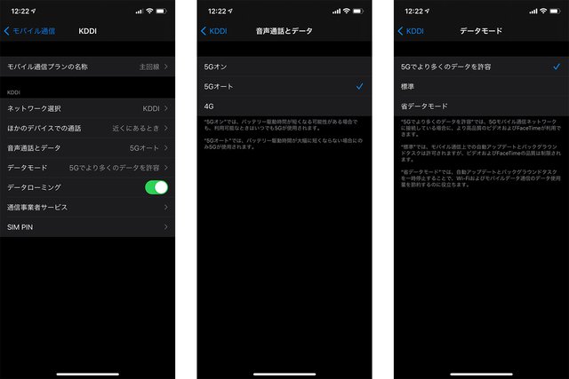 iPhone 12シリーズをauの5Gネットワークで利用する場合、モバイル通信設定から「5Gオート」を選択しておけばバッテリーの消費がかさむ5G接続を、用途によって自動で4G接続に切り換えて消費電力を最適化してくれる。コンテンツをストリーミング/ダウンロードする際にギガの減りを気にせず速度優先で行いたい場合などはデータモードの設定を「5Gでより多くのデータを許容」にチェックを入れておく