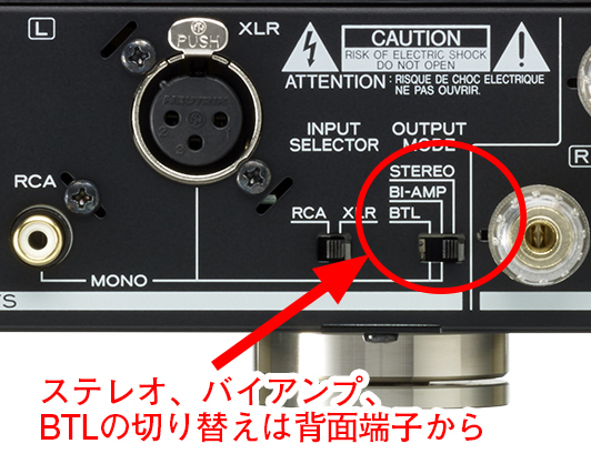 バイアンプやBTLによるモノラル駆動も可能。端子部にモノラルでの接続方法も記載されているので、指示の通り接続しよう