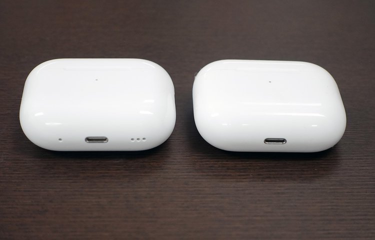 左が第2世代AirPods Pro、右が初代のケース。底部にスピーカーが、側面にはストラップループが加わった