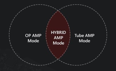 OP-AMP/TUBE-AMPの2モード、そして2つを融合させたHYBRID-AMPの計3モードを使い分けられる