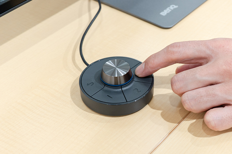 作業効率を飛躍的に高めてくれる独自のOSDコントローラー「ホットキーパックG2」も付属。3つのファンクションキーと1つの回転ダイヤルキーを備え、カラーモードの切替や明るさ、コントラスト、音量の調整などを直感的に行うことが可能。ボタンの設定は好みに応じてカスタマイズすることもできる