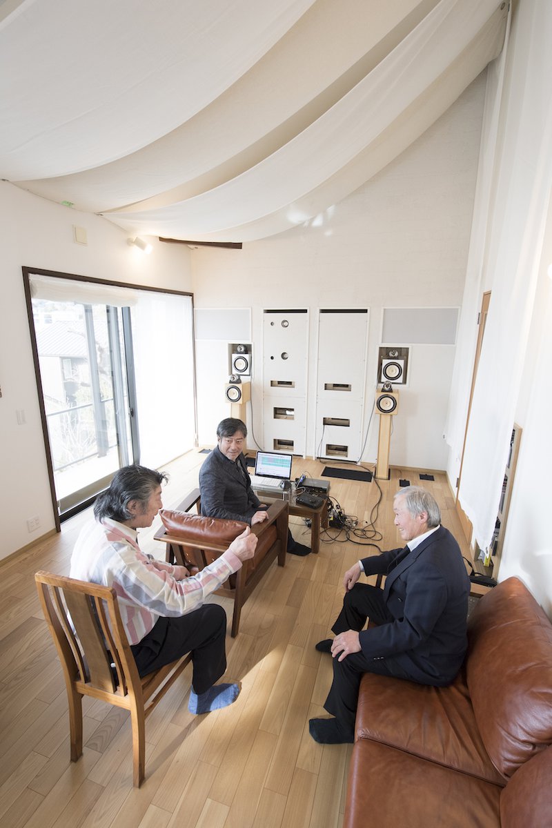 プロデューサーの武藤敏樹氏(中央)と筆者・福田雅光氏(左)。秋谷スタジオのオーナー伊藤 篤氏(右)は超低域まで再生できるシステムを家ごとリフォームして作った