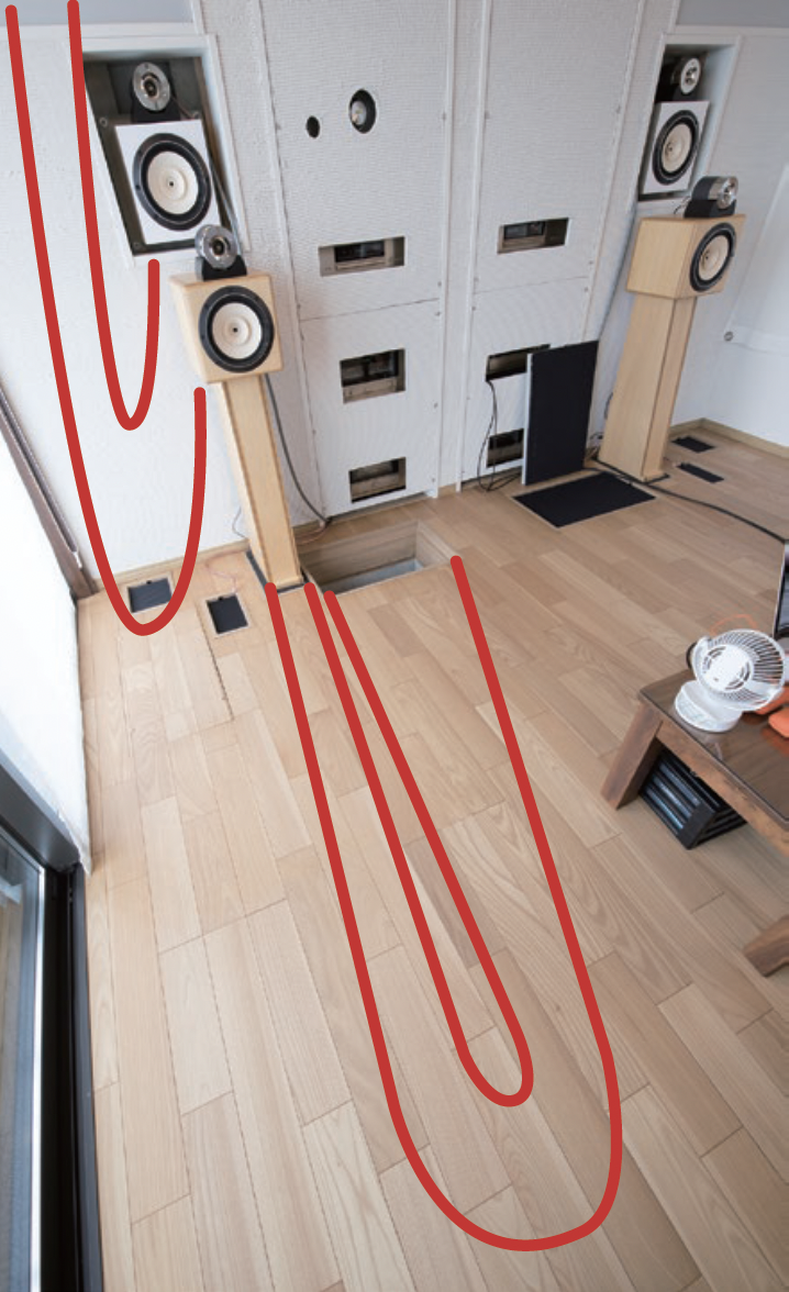 床下と壁裏のコンクリートホーンは上掲のように、折り返すような形をした管状のホーンとなっている。壁裏のホーンは地下まで潜っている(上の赤い線は概念図)