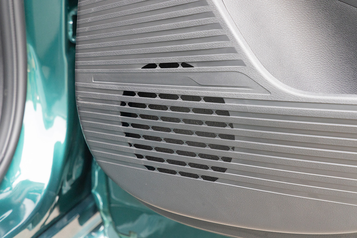 後席ドアの内貼り部。ユニット取付位置はあるものの、スピーカーは入っていない