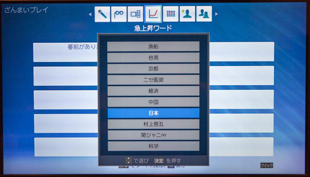 巷で話題になっているキーワードを最大10件までリストに表示、キーワードを含む関連番組を素速く探せる「急上昇ワード」