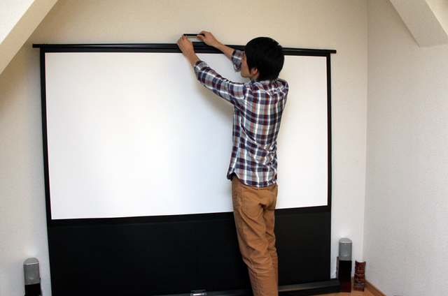 スクリーンは80型の立ち上げ式。使わないときは降ろしておけるので、生活空間を邪魔しない