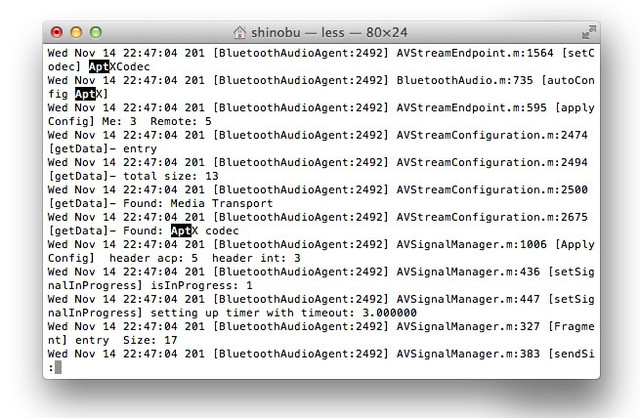 念のためログを調べたところ、apt-Xでネゴシエーションされている様子を確認できた