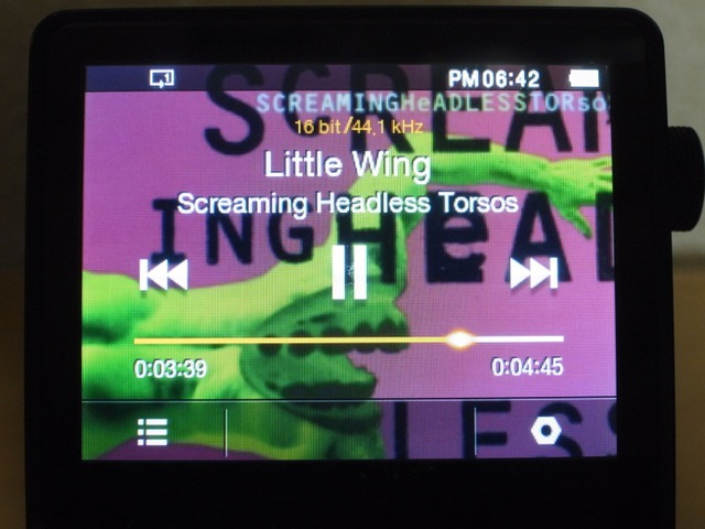 再生中の曲の情報&操作画面。左下のリストアイコンでブラウズ画面に戻り、右下のナット(六角)アイコンからはプレイリストへの追加やより細かい情報の表示などが行える