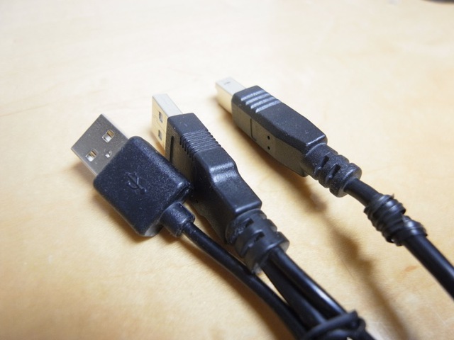 付属のUSBケーブルはPC側が二股。USB端子からの電源供給が足りない場合は二股の両方をPCの各USB端子に接続することで電源供給をブーストできる