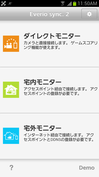 スマホの「Everio Sync.2」のトップメニュー(写真はAndroid版)