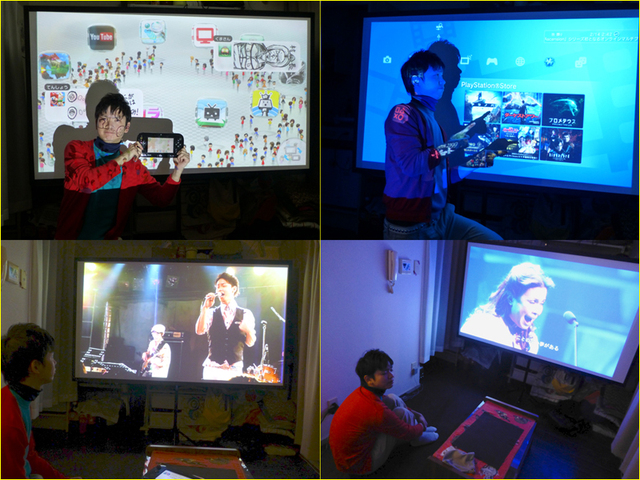 PS3やWii Uをつないでゲームやネット動画、映画を満喫。「びせともや」の名前で歌手活動をしている備瀬さん、YouTubeにアップされている自分のライブも大画面で楽しんでみた(写真左下)