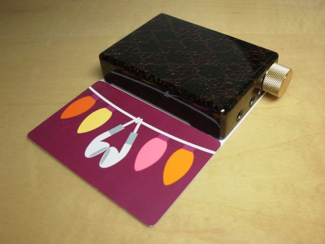 大きさはポータブルヘッドホンアンプとしてごく普通。例によってiTunes Cardを下に敷いて比較すると、底面積はほぼカードサイズ