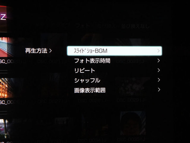 スライドショーのBGMやフォト表示時間などの選択メニュー。スライドショーでのフォト表示時間は3段階から選択できる