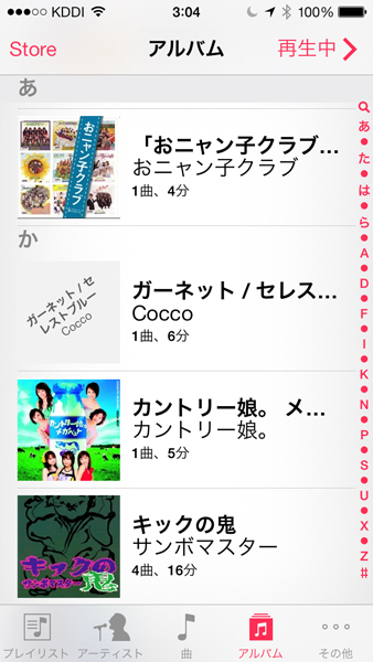 iOS 7での「アルバム」表示。アートワークをより大きくレイアウト。なおアートワークのない場合はテキスト情報を斜めにちょっとかっこよくレイアウトして表示